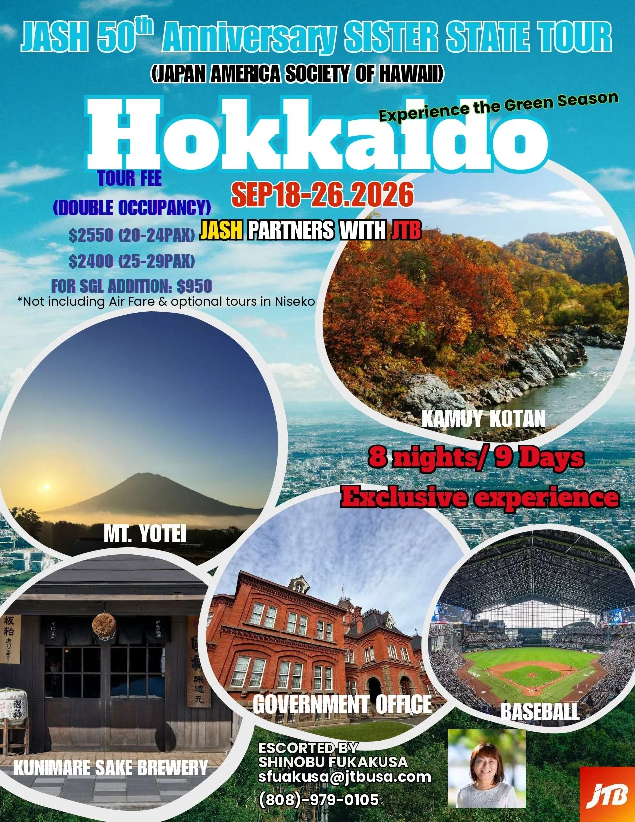 Celebrate JASH’s 50th Anniversary with a special Sister State Tour to Hokkaido from September 18–26, 2026, presented in collaboration with JTB USA. This commemorative journey will take participants to Hokkaido, Hawaiʻi’s sister state, offering a meaningful opportunity to deepen cultural connections and honor five decades of friendship and exchange. Join us for an unforgettable experience celebrating the enduring ties between Hawaiʻi and Japan.