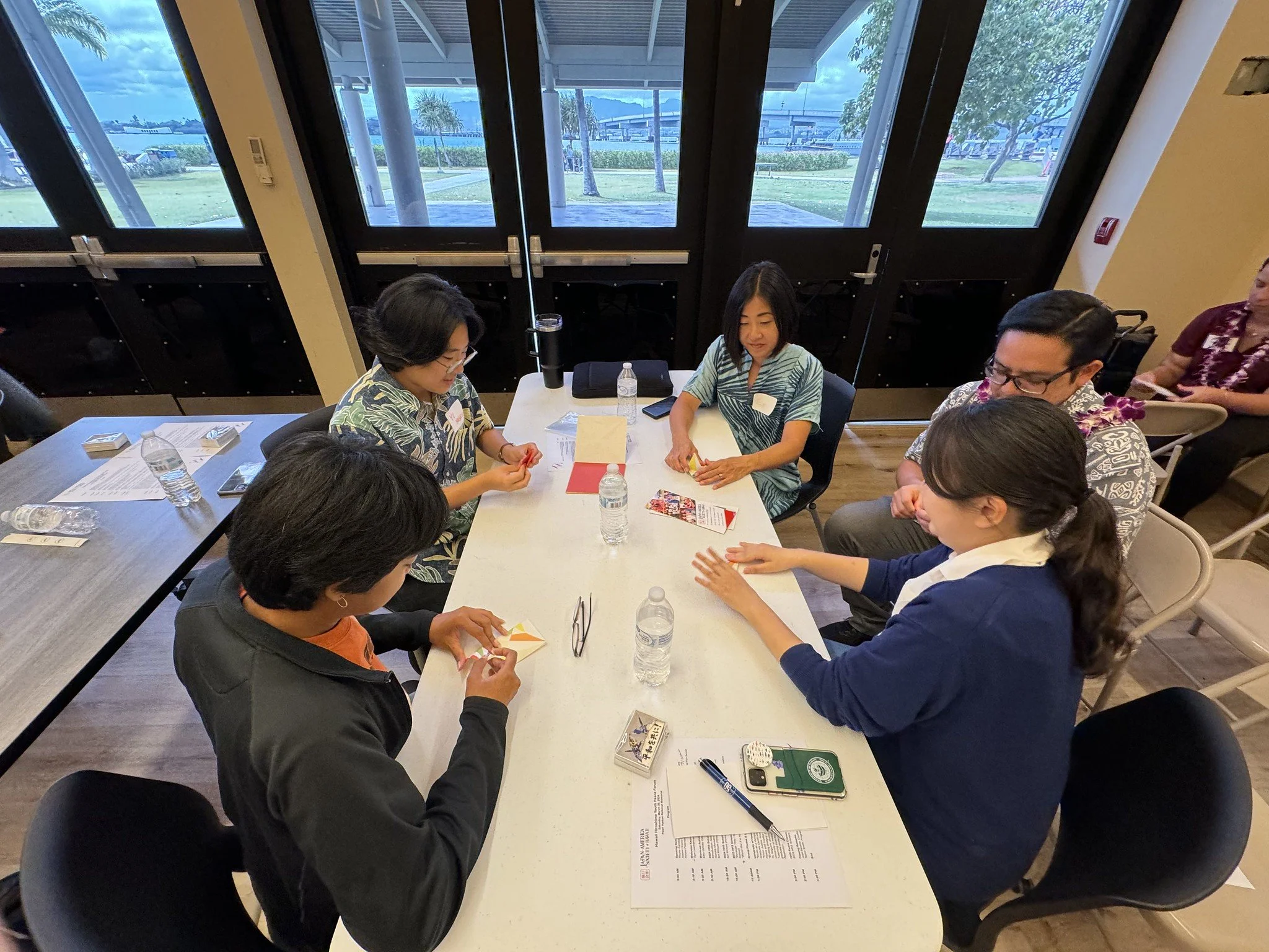 Everyone participating in the hands-on activity of folding and stringing orizuru peace cranes