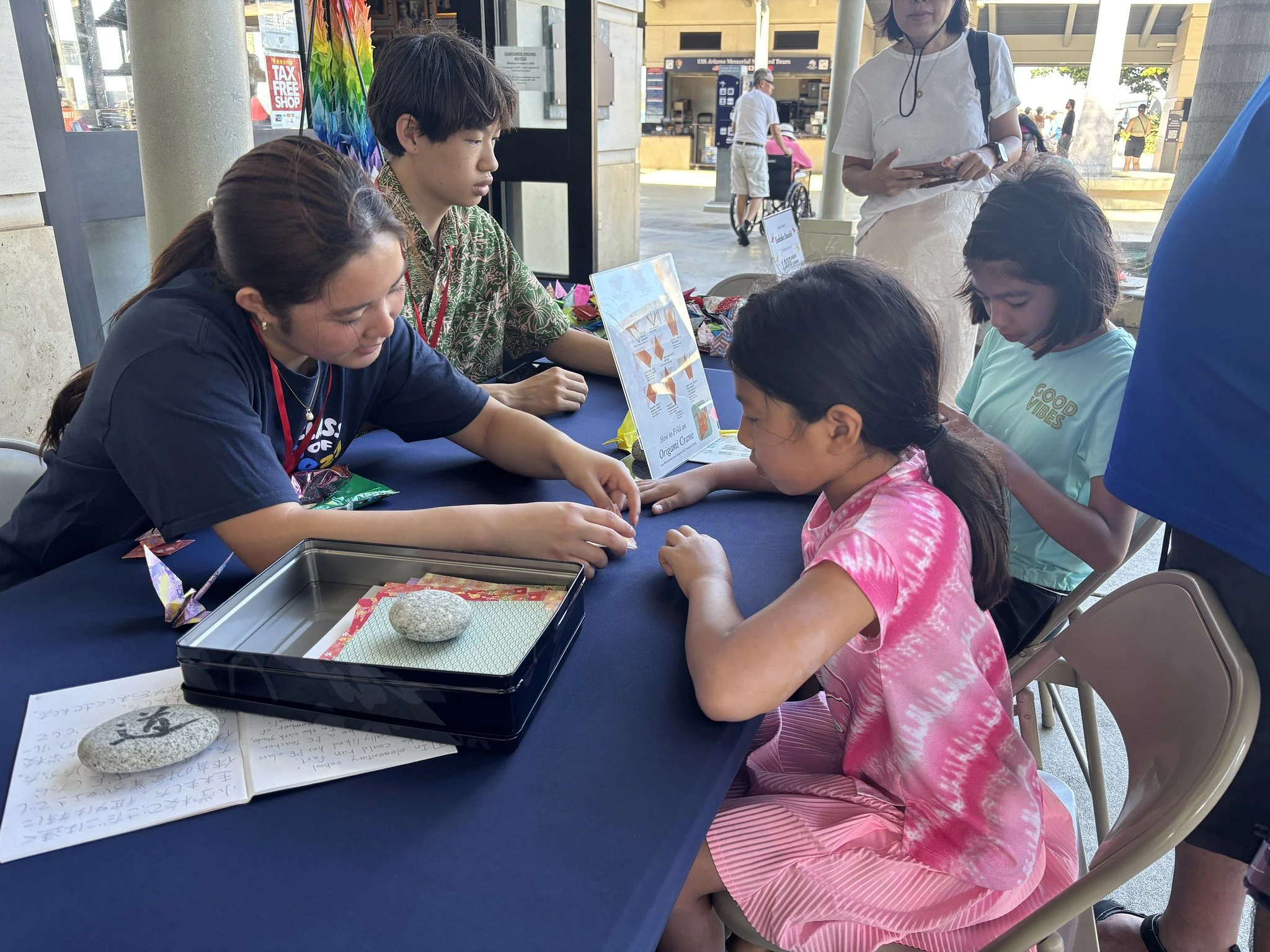 The Japan-America Society of Hawaii (JASH), in collaboration with Pacific Historic Parks (PHP), continues to host the Sadako Peace Project at the Pearl Harbor National Memorial once a month during select months of the academic school year. During the fall semester, high school student volunteers participated with us on September 27. In the spring semester, intermediate, high school, and college students participated on February 7, April 4, and April 18. Volunteers helped share the inspiring story of Sadako Sasaki and her enduring message of peace with memorial visitors, as they learned how to fold peace cranes and also received cranes folded by students in Japan. These cranes are sent to JASH as part of world history and peace studies lessons coordinated by teachers across Japan.